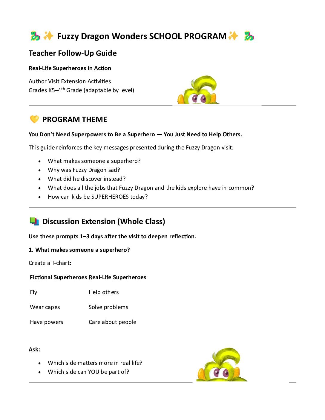A visit with students to move Fuzzy Dragon off the page and into the hearts and minds of school children. The author will provide a full reading of her new book to her intended audience.